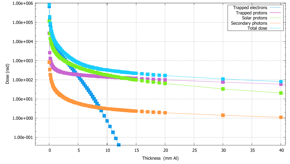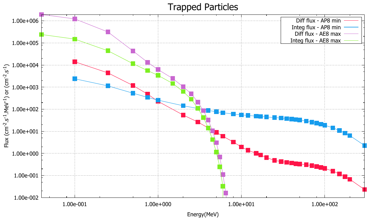 - Modeled trapped particles (AE8/AP8 models), solar particles, and galactic cosmic rays (ISO-15390 model).
