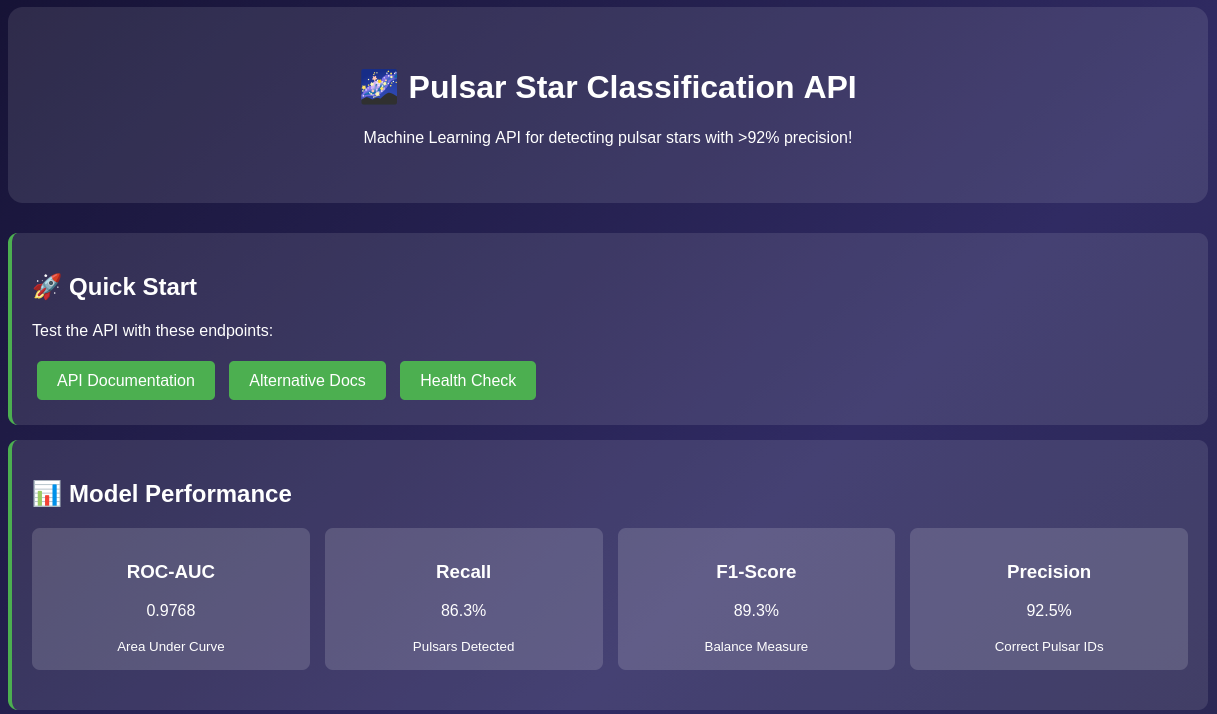 This project demonstrates end-to-end machine learning capabilities from research to production deployment. The successful classification of pulsar stars showcases practical application of ML in scientific domains.